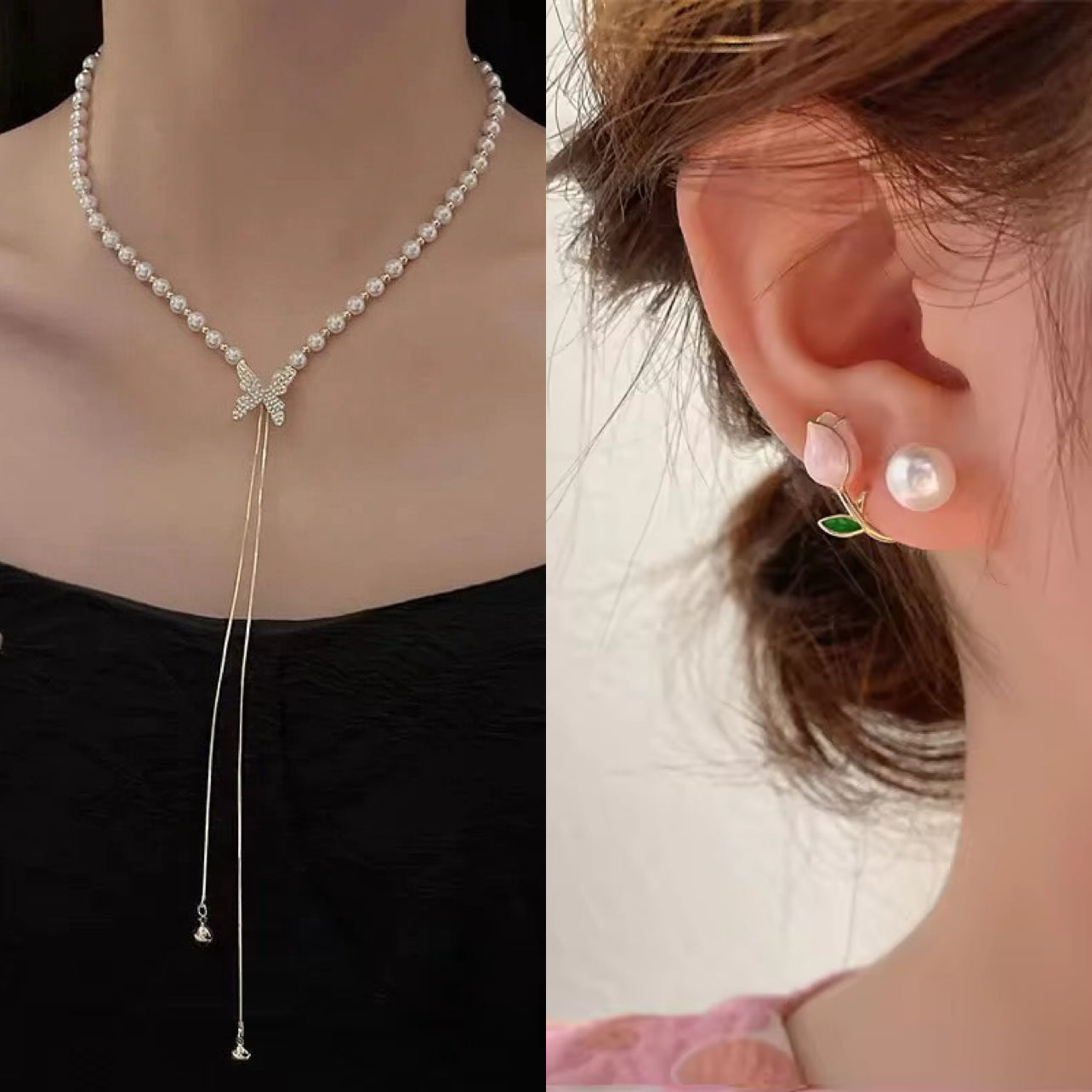 Elevate your style with the Butterfly Bliss Set, featuring a celebrity-inspired adjustable butterfly necklace and pearl rose flower studs. Perfect for any occasion, this elegant combo adds a touch of grace to your look.